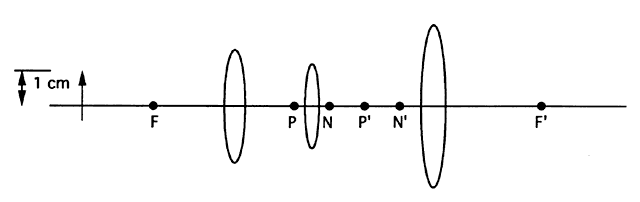STEP 1. Ignore the presence of the lenses because the locations of the cardinal points completely determine the properties of an ideal system. If necessary, redraw the object and optical system to scale using just the optical axis and cardinal points. Draw the principal planes through the principal points and normal to the axis (Fig. 26).