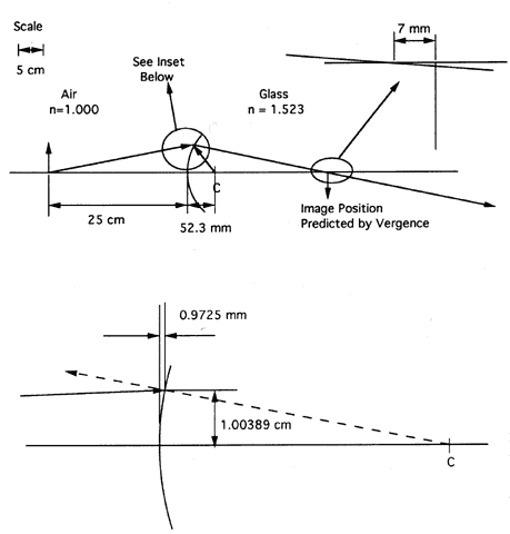 Thus, the angle of refraction, R, is 8.72472°. This ray intersects the optical axis at 24.64543 cm behind the vertex. Note that according to the vergence calculation, the ray should intersect the axis 25.38 cm behind the vertex. The exact calculations show that this ray is actually some 7.3 mm in front of the position predicted. Why? The exact ray trace was performed with a ray that was not close enough to the axis to qualify as a paraxial ray. Vergence calculations are paraxial calculations only. |
