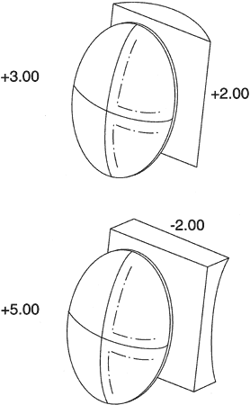 Figure 13 illustrates, using optical crosses, the surface powers used to make a minus cylinder design lens of power + 3.00 + 2.00 × 090, or + 5.00 -2.00 × 180. The lens has a base curve of + 7.75 D. Many possible combinations of surface powers exist that provide the proper lens power. The surface powers chosen by a lens designer are usually those that provide a lens with the sharpest image across the patient's field of view.