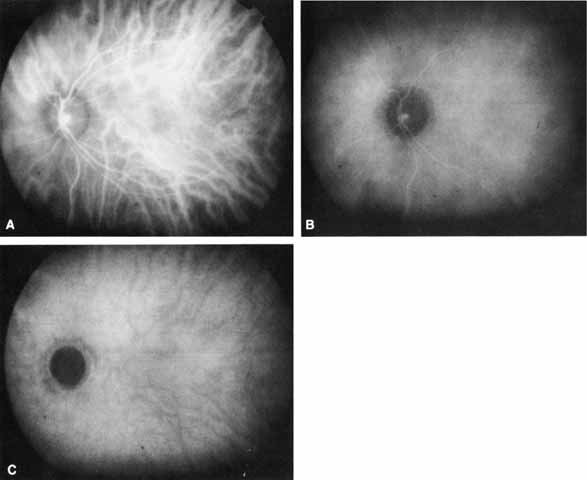 described.3,4,11 The “early” phase (0–3 minutes after injection) encompasses the period from the first appearance of ICG dye in the choroidal arterial circulation to the point of maximal ICG choroidal hyperfluorescence, usually occurring within the first minute after the injection of dye (Fig. 1A). During this phase, both medium and large choroidal arteries and veins are well visualized beneath the hyperfluorescent retinal vasculature. Individual choriocapillaris vessels cannot be distinguished. The areas surrounding middle and large choroidal vessels appear relatively hypofluorescent. This “pseudohypofluorescence” is, at least in part, a result of a smaller volume of blood in the choriocapillaris compared with the larger vessels, with the illumination intensity adjusted for the strongest portion of fluorescence. In the “middle” phase of the angiogram (5–15 minutes after injection), the choroidal veins become less distinct as a nearly homogeneous, diffuse choroidal fluorescence emerges (see Fig. 1B). The fluorescence from the retinal vessels also begins to attenuate. Lesions that demonstrate abnormal hyperfluorescence on ICGA typically begin to stand out in contrast to the fading surrounding normal background fluorescence by this point in the study. In the “late” phases (beyond 18–22 minutes), all details of normal retinal and choroidal vessels are lost as the hyperfluorescence fades even further (see Fig. 1C). The choroidal vessels now stand out in relief as hypofluorescent channels and retinal vessels are no longer visible, and the optic nerve head is dark. There is maximal contrast with any abnormal hyperfluorescent lesions. The edges of such lesions may exhibit some “fuzziness” at this stage, apparently from limited dye leakage. For the standard ICGA, 25 mg (12.5 to 50 mg) of ICG dye in the manufacturer's diluent is administered intravenously in a bolus fashion, similar to intravenous fluorescein angiogram protocols. Images are typically obtained at several second intervals until the retinal and choroidal circulations are maximally hyperfluorescent and then at approximately 30- to 60-second intervals for the first few minutes of the study to capture images through the early phase of the angiogram. Subsequent images are typically taken between 8 and 12 minutes for the middle phase and then between 18 and 25 minutes for the late phase. Most importantly, abnormal ICG hyperfluorescence is sufficiently identifiable by 25 minutes, but, occasionally, images obtained 30 to 40 minutes into the study are helpful. To image retinal and choroidal vessels in the late phase of the angiogram, a technique of reinjecting a small amount of ICG dye at 30 to 40 minutes into the study has been described.33 The available software packages of most digital videoangiogram systems have image-enhancing and image-tracing capabilities. Limited improvement of image contrast can be obtained with various enhancement techniques. The ability to align and superimpose images and tracings (“warp tracing”) can be helpful in determining the location or size of a particular angiographic finding, with respect to other anatomic structures (Fig. 2).4,11