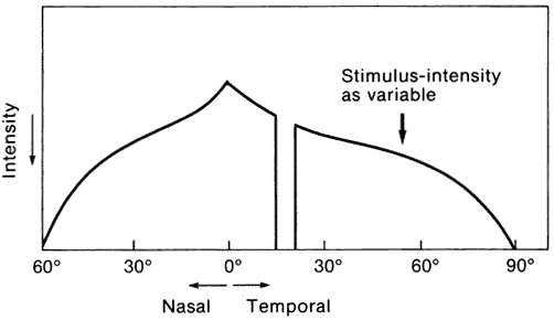 The contour of the island of vision relates to both the anatomy of the visual system and the level of retinal adaptation. The highest concentration of cones is in the fovea; most of these cones project to their own ganglion cell. This one-to-one ratio between foveal cone and ganglion cell results in maximal resolution in the fovea. The sharp-peaked island of vision described by Traquair reflects the visual field in the light-adapted or photopic visual field. The contour of the island of vision changes greatly in the mesopic (twilight) and scotopic (dark-adapted) states. As one proceeds from a photopic to a scotopic state, overall retinal sensitivity increases as rod, rather than cone, vision predominates. In the dark-adapted island of vision, the contour is flatter than in the light-adapted state, and a central depression, rather than a central peak, exists in the area of the fovea. Thus, the level of retinal adaptation is crucial in defining the contour of the island of vision (Fig. 3).2 |