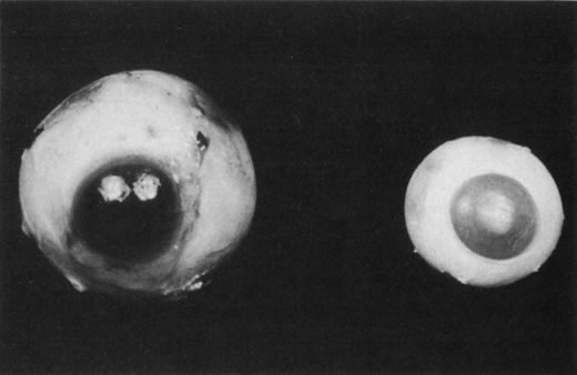 Although the anatomic success rates in these studies are encouraging, the visual results in general are disappointing. The reasons for poor visual results in these infants remain speculative. Some infants may have cerebral dysfunction as a result of complications of prematurity, such as intraventricular hemorrhage. In these infants, the macula is immature, and detachment of this immature retina may have a more devastating effect on photoreceptors and their development than in the adult macula. Amblyopia may play a role as well. COMPLICATIONS AND THEIR MANAGEMENT The complications of scleral buckling surgery for ROP are similar to those that can occur with adult scleral buckling surgery, with some special considerations for the infant eye. The premature infant's eye is significantly smaller than an adult eye. Full adult size of the globe is not attained until 3 years of age. An infant at 34-weeks' gestation has an eye that is 15 mm in diameter (Fig. 9). The sclera of the infant eye is thin, and the surgeon must be especially careful when depressing, cutting a bed, and passing sutures.
